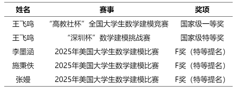 在顶尖赛事中屡创佳绩:1名学生勇夺“高教社杯”全国大学生数学建模竞赛一等奖,展现扎实数理功底;1名学生在“深圳杯”数学建模挑战赛中脱颖而出,斩获全国唯一特等奖——“谭永基特别奖”,系国产a片 第二次在此顶级赛事中摘得桂冠,续写辉煌;3名学生在美国大学生数学建模竞赛中斩获F奖(特等奖提名),在国际舞台上有力彰显国产a片 统计学科实力与学子风采。