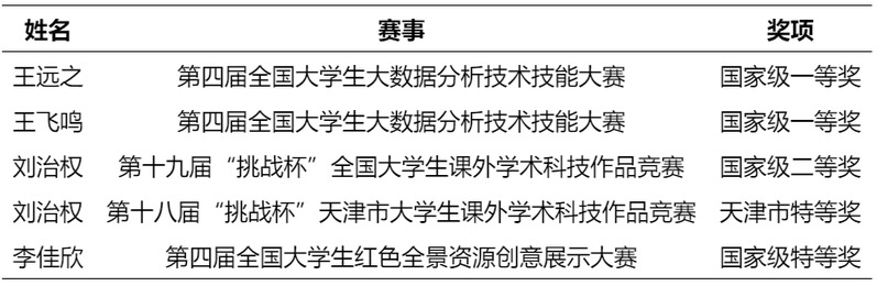 专业领域与综合赛事齐头并进:2名学生在第四届全国大学生大数据分析技术技能大赛中荣膺一等奖,凸显过硬专业实操能力;1名学生获第十九届“挑战杯”全国大学生课外学术科技作品竞赛全国二等奖、第十八届“挑战杯”天津市大学生课外学术科技作品竞赛天津市特等奖,实现从区域领先到全国出彩的持续突破;1名学生斩获第四届全国大学生红色全景资源创意展示大赛全国特等奖,推动专业能力与思政教育深度融合,实现价值引领与知识传授同频共振。
