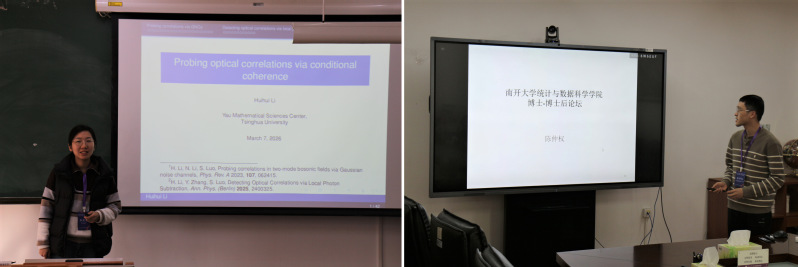 论坛按学科方向进行两场学术报告。与会青年学者围绕数理统计前沿理论、统计学习方法及其应用、交叉学科中的数据分析等主题,分享了各自研究领域的最新成果。报告内容既涉及统计学核心理论的方法创新,也涵盖人工智能、量子信息、生物医学、城市科学等前沿交叉方向,充分体现了统计与数据科学学科在赋能基础研究与服务社会发展中的广阔前景。与会师生踊跃提问并与报告人深入探讨,现场学术氛围浓厚热烈。